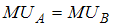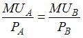 Условие максимизации полезности потребителя при приобретении товаров А и В в рамках кардиналистского подхода, выделяющего категории общей полезности (TU) и предельной полезности (MU), определяется следующим условием …