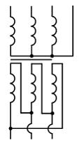 Схеме соединения обмоток трехфазного трансформатора «звезда − звезда» с выведенной нулевой точкой обмотки низшего напряжения соответствует рисунок …• • • •
