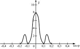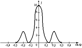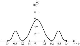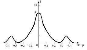 – угол дифракции). Зависимость интенсивности от синуса угла дифракции, соответствующая случаю освещения светом с наибольшей частотой показана на рисунке …
