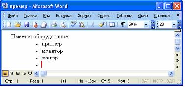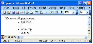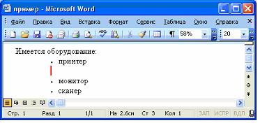 В текстовом редакторе набран текст, содержащий список. Курсор (его положение отмечено вертикальной черточкой красного цвета) находится в конце первого элемента списка: