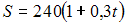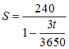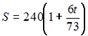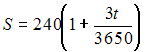 Если временная база по начислению процентов равна 365 дням, то размер долга S (тыс. руб.) фирмы банку через t дней можно определить как …
