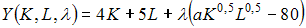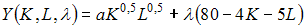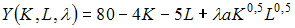 на аренду фондов (капитала) и оплату труда выделено 80 у.е., стоимость аренды единицы фондов равна 4 у.е., ставка заработной платы 5 у.е.При решении задачи на максимизацию объема выпуска функция Лагранжа имеет вид …