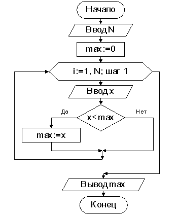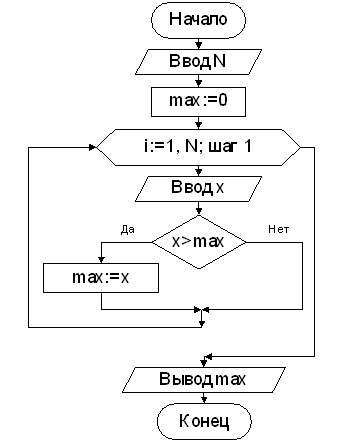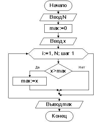 Дано N целых положительных чисел. Алгоритм определения максимального значения последовательности будет иметь вид …• • • •