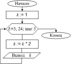 Одноклеточная амеба каждые 3 часа делится на 2 клетки. Алгоритм определения количества амеб k через 3, 6, 9, 12, …, 24 часа будет иметь вид…• • • •