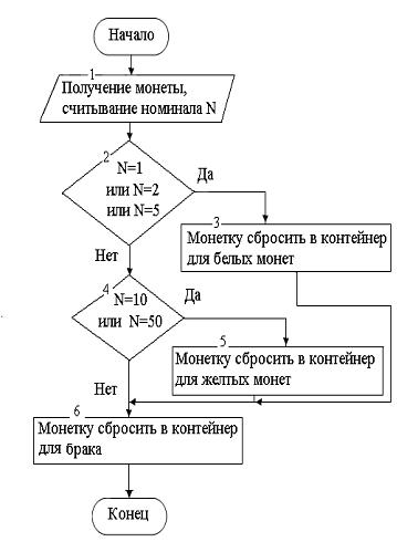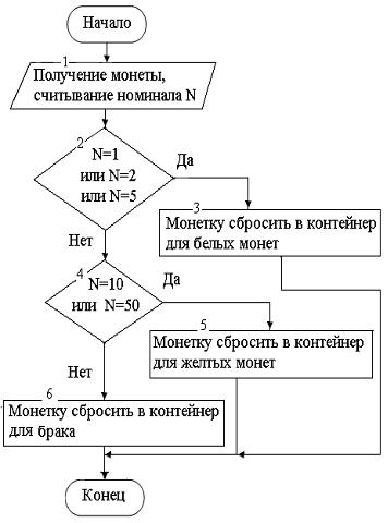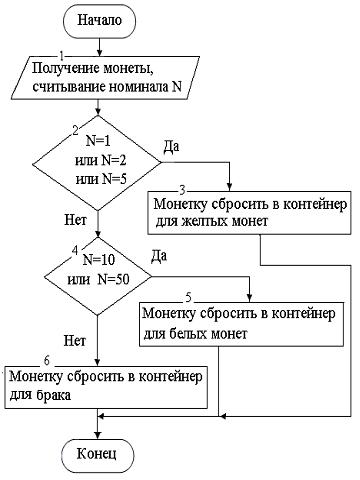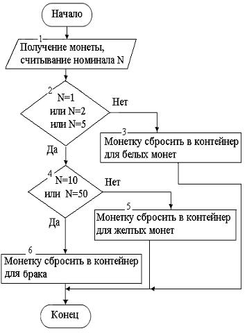 Некоторый автомат, не различающий цвета, но умеющий считывать номинал монеты, производит сортировку монет по цвету – желтые в один контейнер, а белые в другой (биметаллические монеты считаются желтыми). Блок-схема алгоритма сортировки монет по цвету может иметь вид …