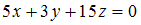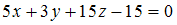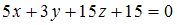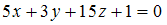 и отсекает на осях абсцисс и ординат в положительных направлениях отрезки длины 3 и 5 соответственно. Тогда общее уравнение плоскости имеет вид …