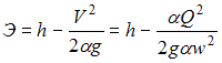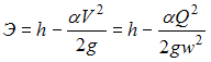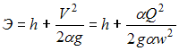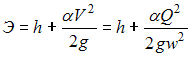 Удельная энергия сечения открытого потока определяется по зависимости ________ , где Q – расход потока, м3/с; w – площадь живого сечения потока, м2; V – скорость потока в данном сечении, м/с; h – глубина потока в данном сечении, м; g – ускорение свободного падения, м/с2.