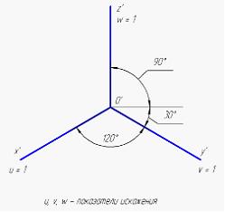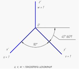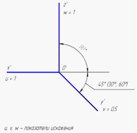 Аксонометрические оси косоугольной фронтальной диметрии и соответствующие им показатели искажения изображены на рисунке …• • • •