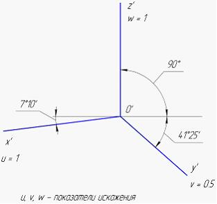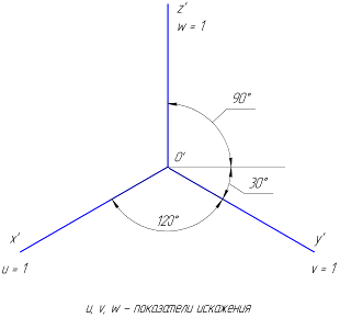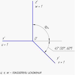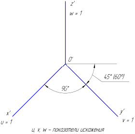 Аксонометрические оси косоугольной горизонтальной изометрии и соответствующие им показатели искажения изображены на рисунке …• • • •