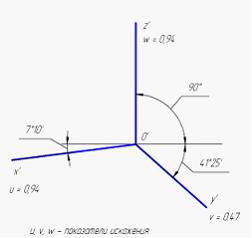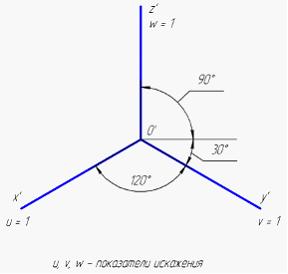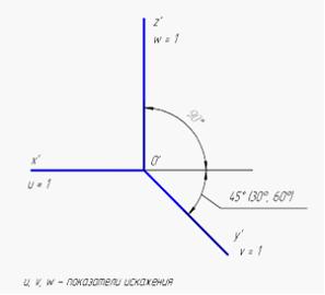 Аксонометрические оси точной прямоугольной изометрии и соответствующие им показатели искажения изображены на рисунке …• • • •
